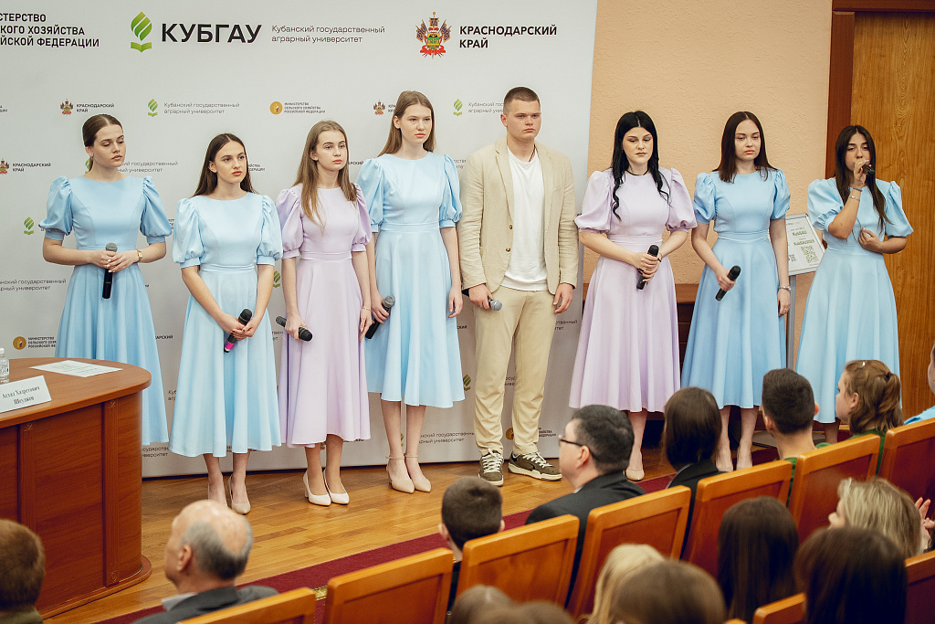 В зале собрались студенты факультетов агрохимии и защиты растений, плодоовощеводства и виноградарства, а также преподаватели, сотрудники и гости вуза. Среди присутствующих – проректор по международной и молодёжной политике Татьяна Полутина, академик РАН, доктор биологических наук, профессор, заслуженный деятель науки РФ, лауреат Премии Правительства РФ в области образования, Герой труда Кубани Асхад Шеуджен, декан факультета агрохимии и защиты растений, доцент Иван Лебедовский, декан факультета плодоовощеводства и виноградарства Михаил Осипов и председатель совета ветеранов КубГАУ, профессор Людмила Онищенко.